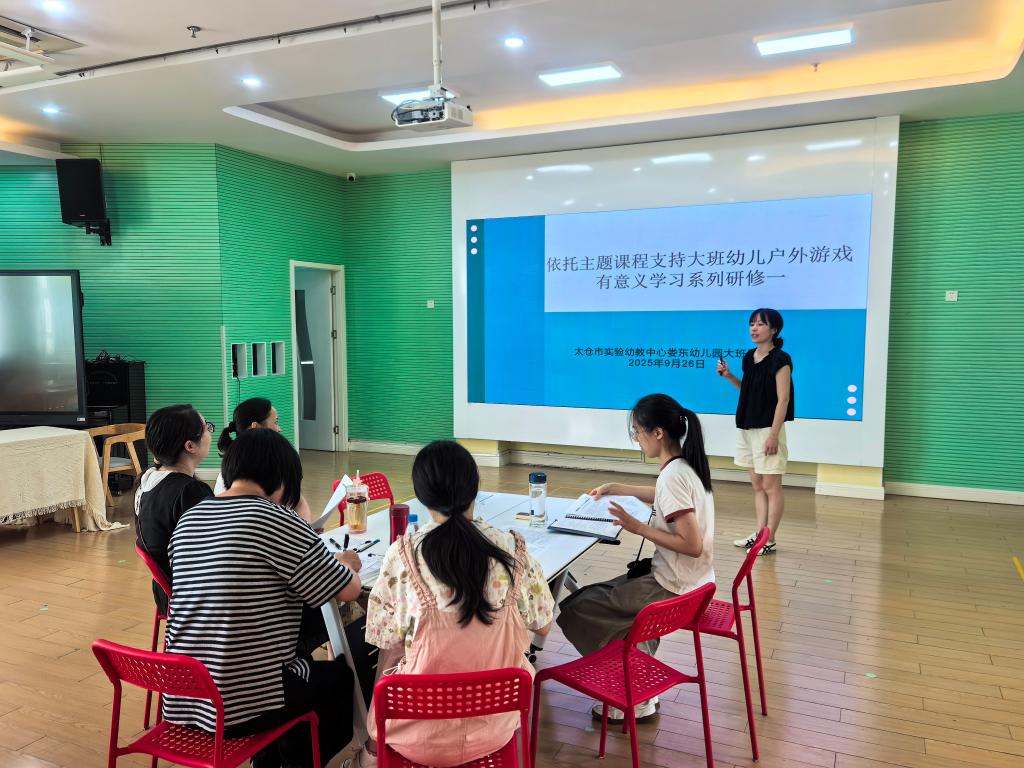 为解决“有游戏无主题”、“有材料无层次”的现实困境,实现主题课程与户外游戏的深度融合,支持幼儿在户外获得有意义的连续性学习经验,2025年9月26日中午12点,太仓市实验幼教中心娄东幼儿园大班组开展了依托主题课程支持大班幼儿户外游戏有意义学习系列研修一,本次教研由许施施老师主持,全体大班组教师参与了此次教研活动。