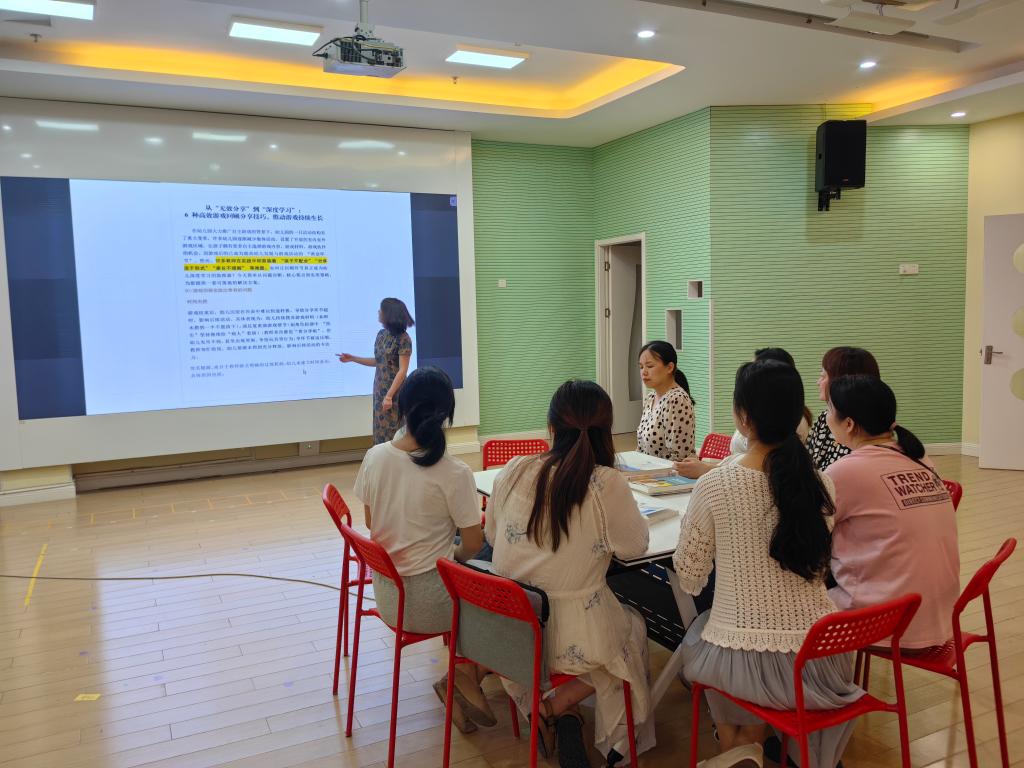 在“回顾与审视”环节,教师们坦诚交流了各自组织分享环节的现状与经验,既肯定了已有成效,也直面了实践中遇到的挑战。随后,活动进入“学习与启迪”阶段,教师们共同研读了《幼儿游戏的观察与解读》《小脑袋,大问题》等专业著作中的相关章节,深入探讨了如何运用“回顾性谈话”和“高水平提问”策略,帮助幼儿梳理在“彩虹长廊”中的复杂游戏体验,将理论智慧与教学实践紧密连接。