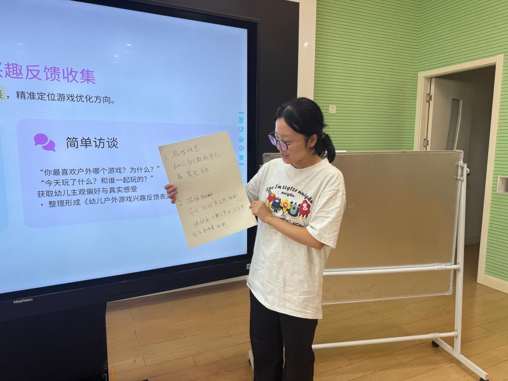 基于讨论共识,教师们进一步明确了改进方向:一方面,将着力丰富自然材料供给,计划引入秋日果实、多彩落叶、形态各异的石块等,增强游戏材料的多样性与自然属性;另一方面,拓展游戏情境,补充角色扮演与户外表演类道具,如多元化的“娃娃家”用品、富有特色的表演服饰、可供敲击发声的简易乐器等,激发幼儿的想象与表达。同时,教师们还共同完善了《小果园资源汇总表》,从“资源名称、所处位置、当前状态及潜在教育价值”四个角度系统梳理资源信息,为后续游戏活动的设计与实施提供有力依据。