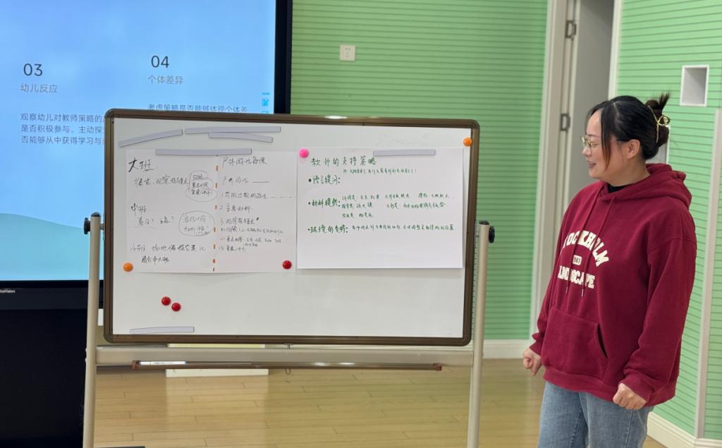 在研讨环节,教师们结合《3-6岁儿童学习与发展指南》,深入分析了幼儿行为背后的学习价值,并围绕“教师介入时机”“提问的有效性”“个体差异应对”等话题展开热烈讨论。大家一致认为,有效的支持策略应具备层次性与针对性。卢瑛瑛老师在此基础上提炼出“好奇点燃式提问”“时机捕捉法”“故事引导法”“材料唤醒法”等核心策略,为教师的实践提供了清晰的方向。