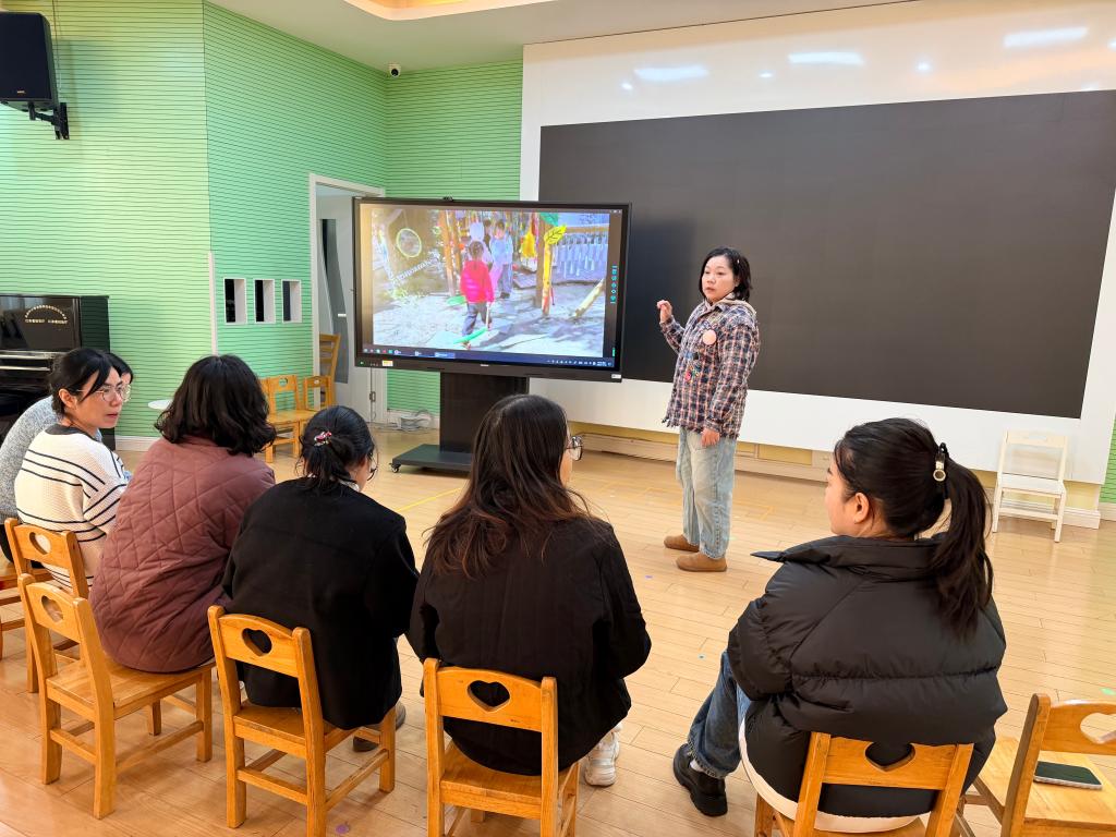 视频观摩环节,教师集体观看“小果园游戏”实录,对照《小班幼儿小果园户外游戏观摩反馈表》,从“游戏环境、幼儿表现、教师指导、游戏价值”四个维度进行量化评分与质性记录。反馈表涵盖空间布局、材料投放、安全性、幼儿参与度、探究水平及教师介入时机等指标,帮助教师系统、直观地梳理优势与不足。随后的交流分享中,大家各抒己见,提出针对性改进建议,为后续环境调整提供实践依据。
