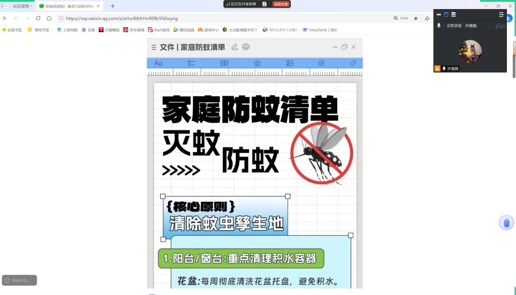 为深化家园共育工作,提升家庭科学防蚊意识,共同预防蚊媒传染病,保障幼儿健康,2025年10月20日中午12:30,太仓市实验幼教中心娄东幼儿园大班年级组开展了一次以“科学防蚊,健康护航”为主题的家委会专题学习活动。本次活动由大班年级组长许施施主持,全体大班家委会成员参与,旨在向家长普及科学防蚊知识,并凝聚家园力量,共同为孩子们营造一个安全、健康的秋季成长环境。
